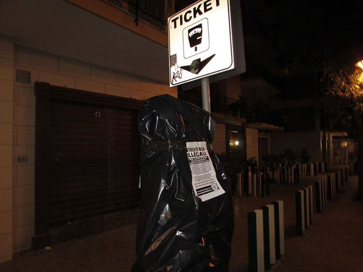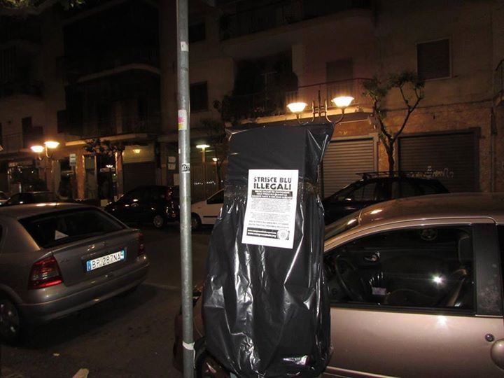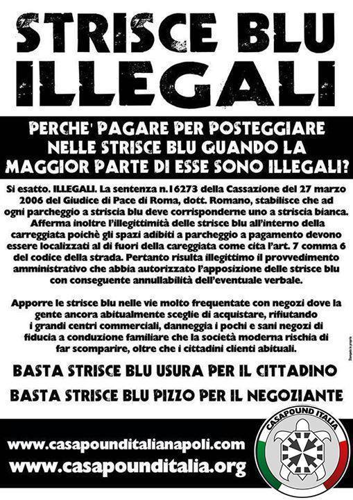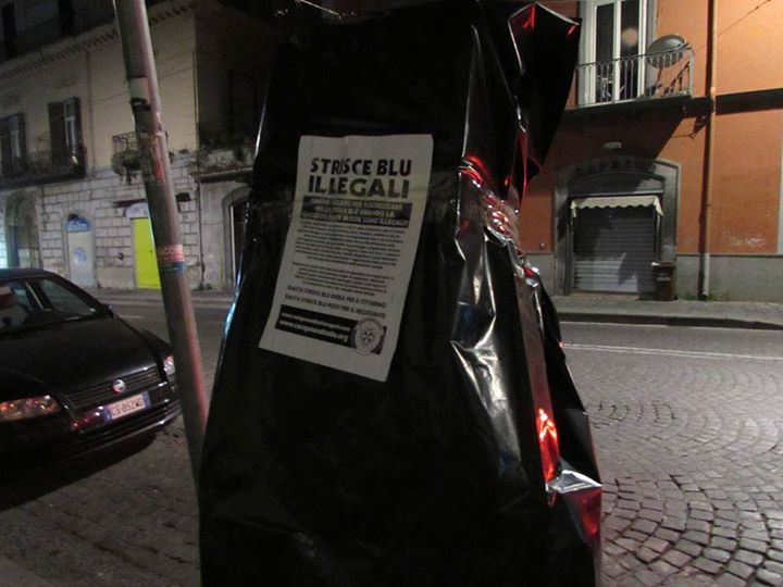 La sentenza della Cassazione n.16273 del 27 Marzo 2006 del Giudice di pace di Roma, stabilisce che ad ogni parcheggio a stiscia blu deve corrisponderne uno a striscia bianca, ma a quanto pare a Portici non è affatto così. Per questo motivo i parchimetri sono stati coperti da CasaPound, un modo per informare i cittadini dell’illegalita di queste strisce blu, diventate usura per i cittadini e pizzo per i commercianti. Proprio questi ultimi, infatti, sono quelli che subiscono più danni poiché il cittadino è inibito dalle strisce blu che non consentono una sosta veloce.