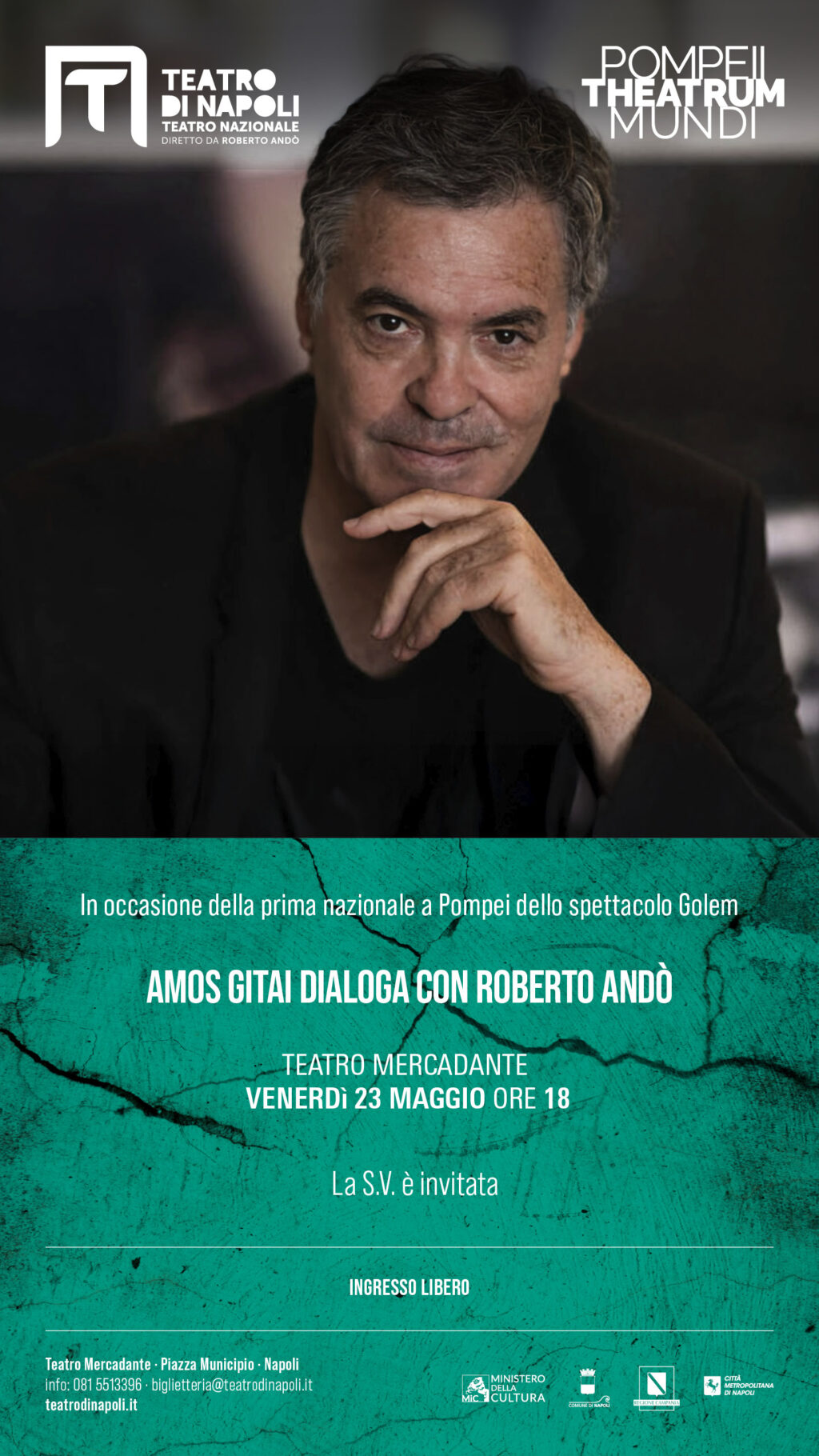 In occasione del debutto in prima italiana dello spettacolo inaugurale dell’ottava edizione della rassegna estiva del teatro di Napoli-Teatro Nazionale Pompeii Theatrum Mundi, GOLEM del regista israeliano AMOS GITAI il 20 e 21 giugno alle 21.00 al Teatro Grande del sito di Pompei, VENERDÍ 23 MAGGIO alle 18.00 al Teatro Mercadante si terrà l’incontro “Amos Gitai dialoga con Roberto Andò”.