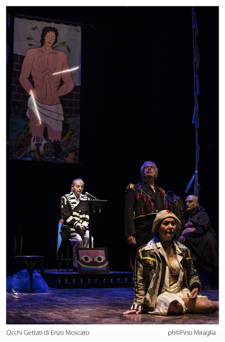 La scena e i costumi sono di Tata Barbalato; la selezione musicale di Dimomos; la produzione del Teatro di Napoli-Teatro Nazionale, Compagnia Teatrale Enzo Moscato / Casa del Contemporaneo. Considerato già nel 1986, anno del suo debutto testo-chiave di Enzo Moscato, ‘Occhi gettati’ si ripresenta oggi in tutta la sua vivezza, come un canto sospeso tra il tragico, il comico, il grottesco, il surreale.