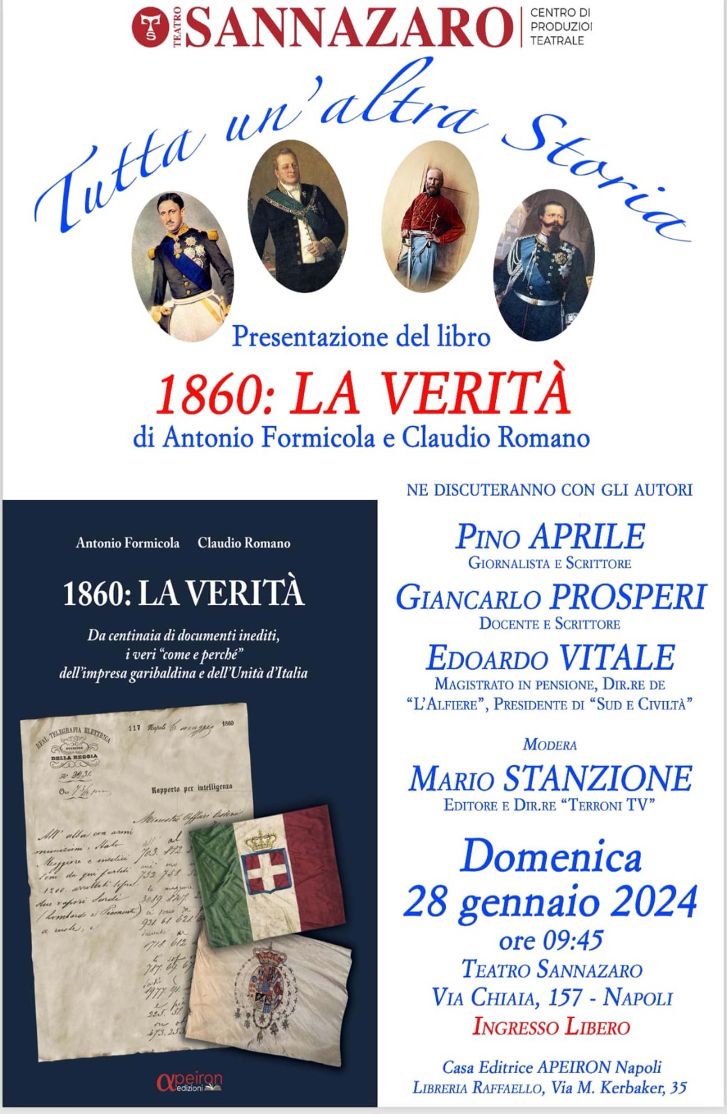 Domenica 28 gennaio 2024, alle ore 9.45, presso il Teatro Sannazaro, in via Chiaia 157, a Napoli, si terrà la presentazione del libro “1860: La verità”, di Antonio Formicola e Claudio Romano.
