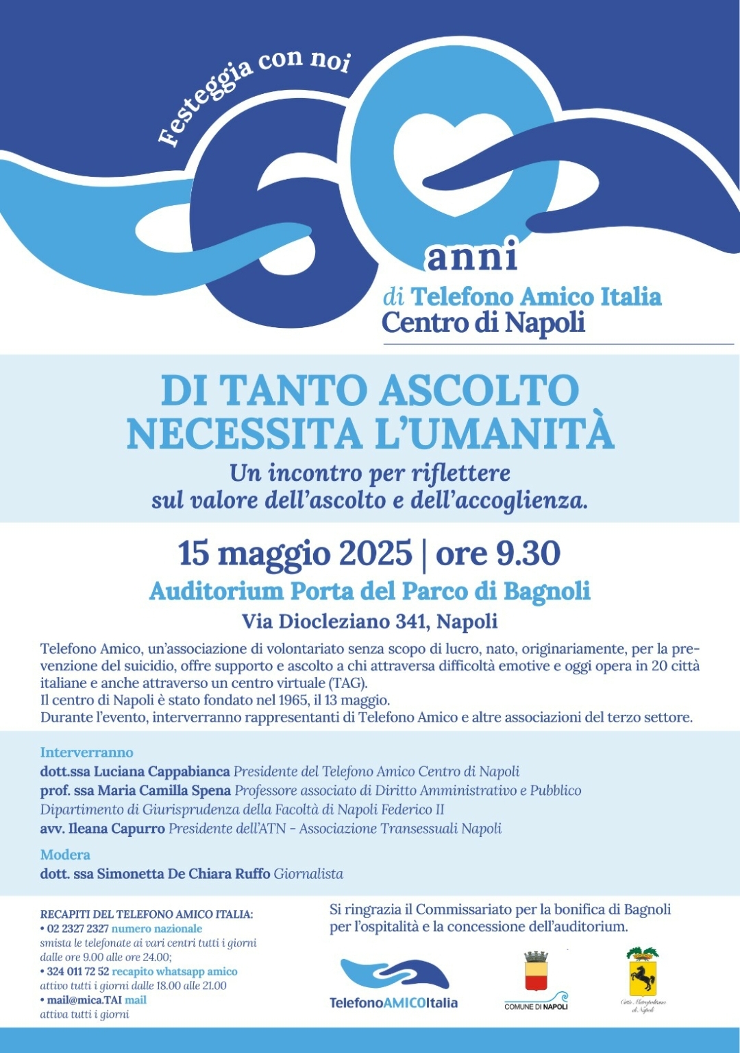 Telefono Amico – Centro di Napoli (TAN) festeggia i suoi 60 anni di attività il 15 maggio 2025, a Napoli, presso l’Auditorium Porta del Parco di Bagnoli.