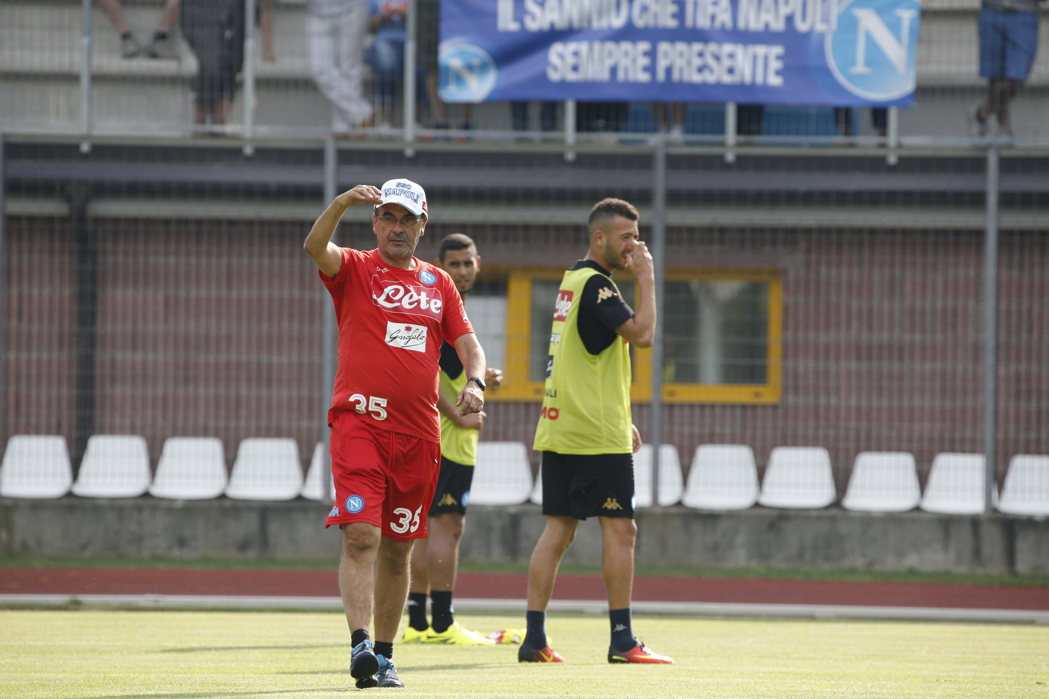 Maurizio Sarri con Gino Rivieccio durante una seduta di allenamento del Napoli a Dimaro per il ritiro precampionato 10 luglio 2016 training preseason SSC Napoli at dimaro Italy