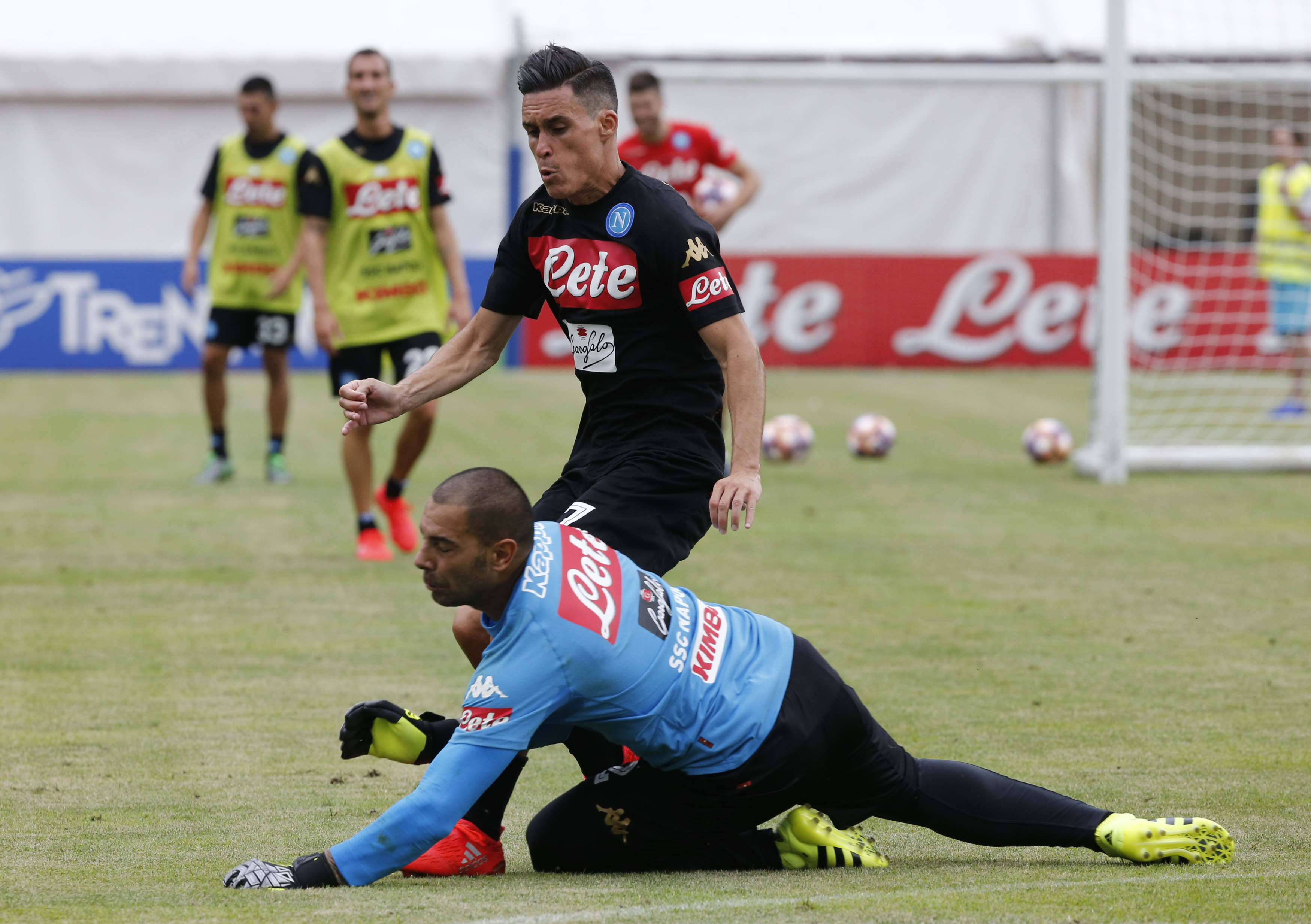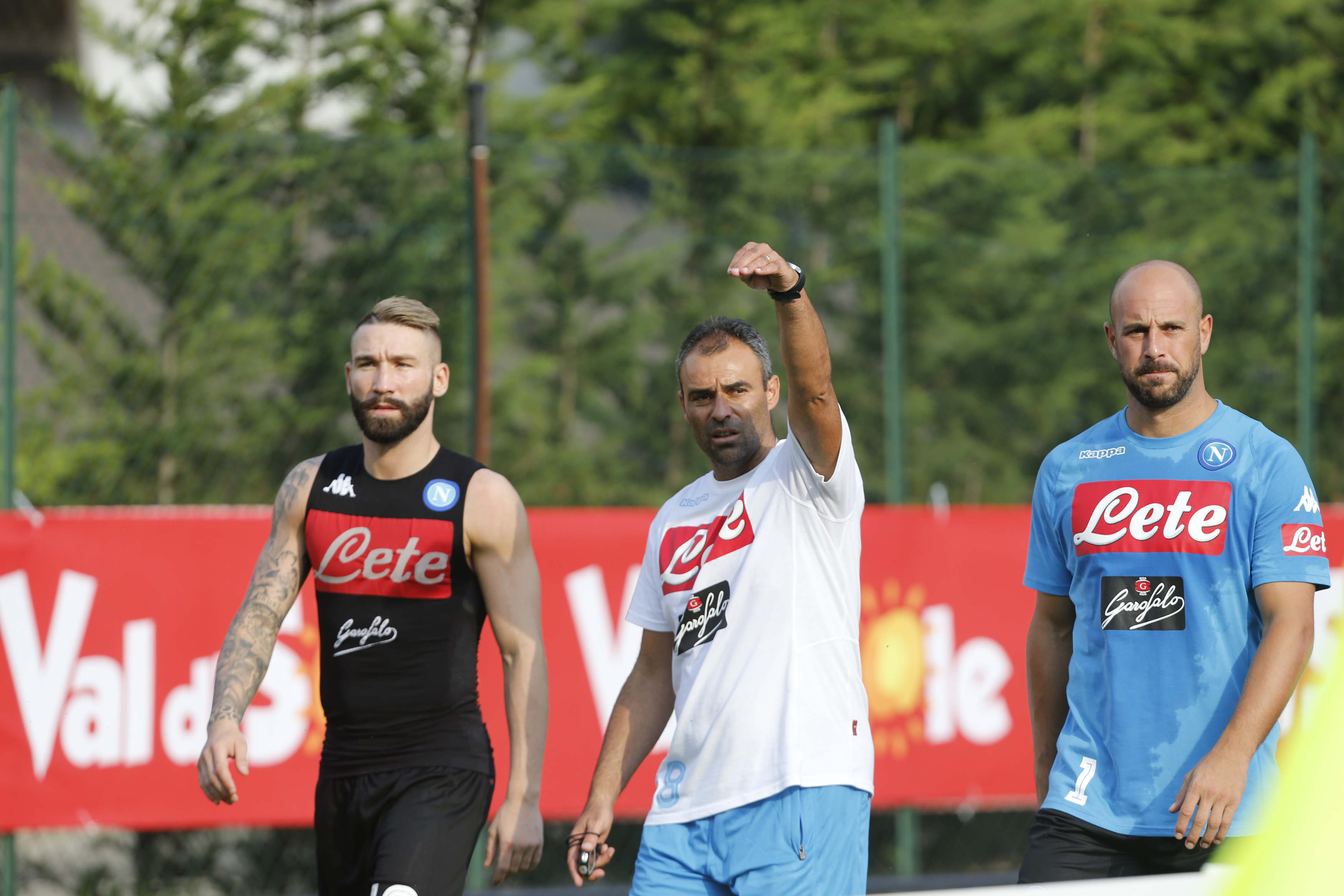 Pepe Reina Raul Albiol durante una seduta di allenamento del Napoli a Dimaro per il ritiro precampionato 10 luglio 2016 training preseason SSC Napoli at dimaro Italy