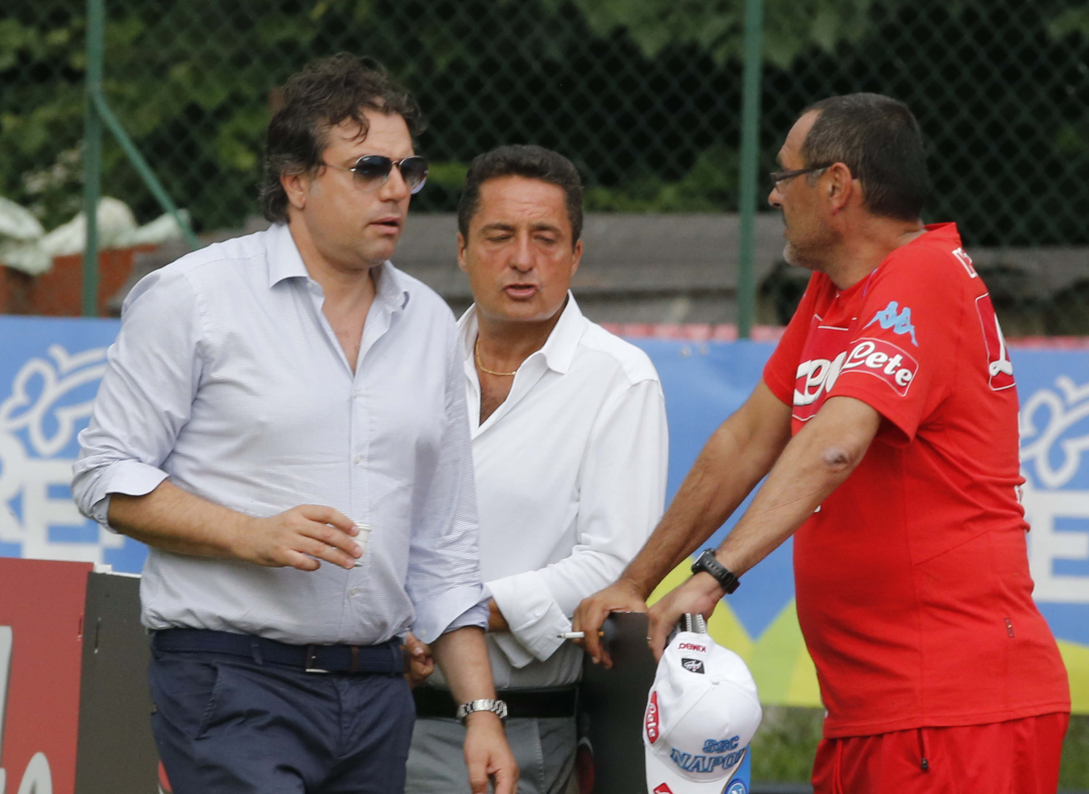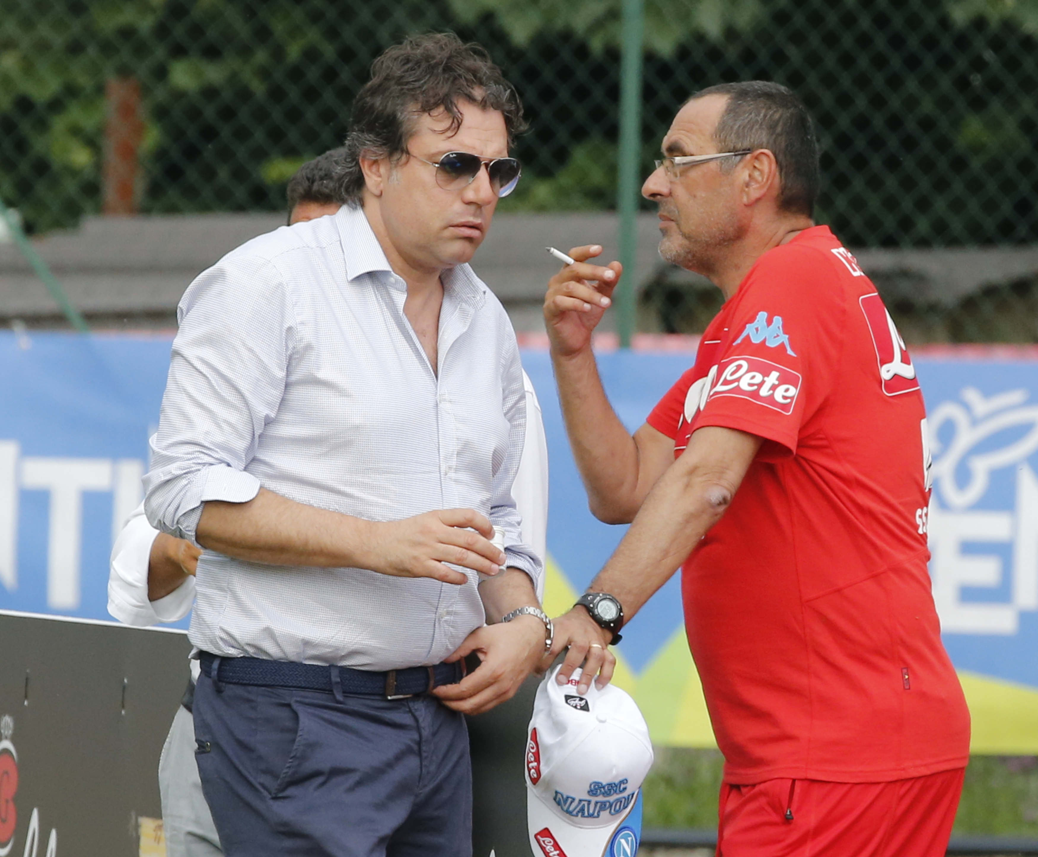 Maurizio Sarri con Cristiano Giuntoli durante una seduta di allenamento del Napoli a Dimaro per il ritiro precampionato 10 luglio 2016 training preseason SSC Napoli at dimaro Italy