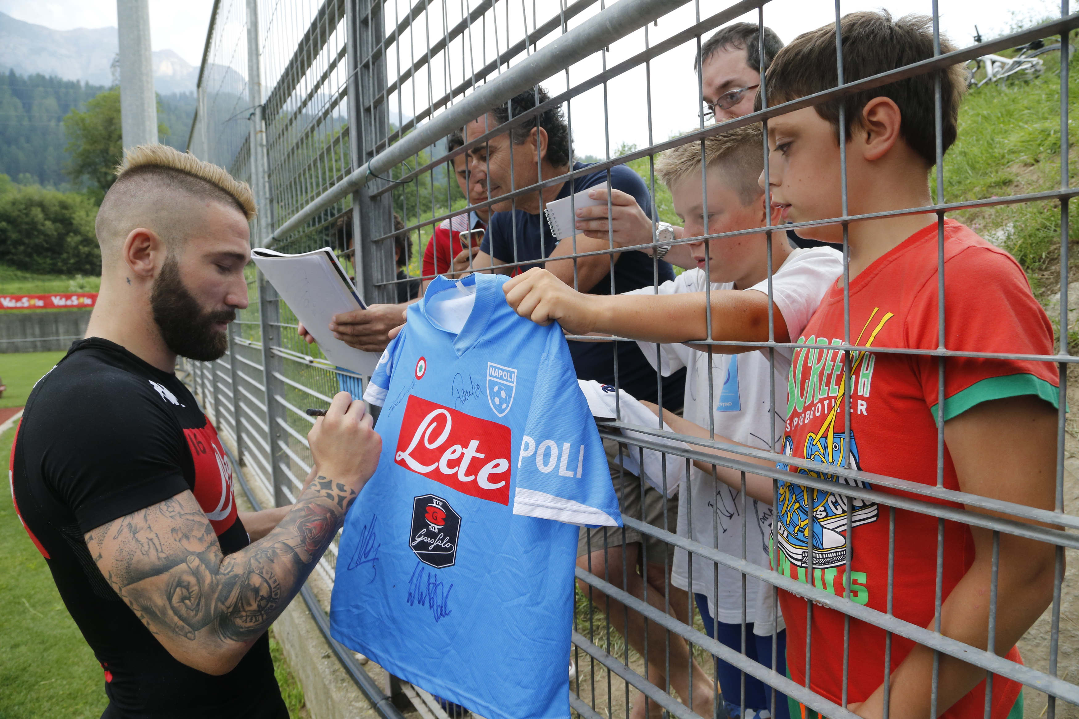 Lorenzo Tonelli firma autografi durante una seduta di allenamento del Napoli a Dimaro per il ritiro precampionato 10 luglio 2016 training preseason SSC Napoli at dimaro Italy