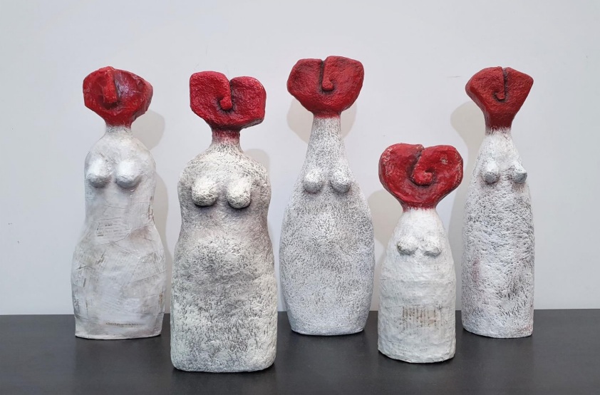 Una serie di statue femminili dai corpi stilizzati e le teste a forma di cuore, rappresentano la donna nella propria essenza e fragilità emotiva che spesso la rende vittima.