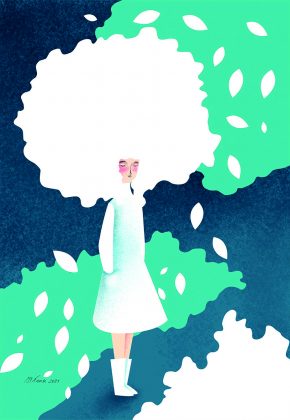 E così, nei colori piatti e segno grafico immediato, con silhouettes ritagliate da fondi protagonisti quanto i personaggi, o in ricami delicati, transitanti oltre i contorni tra forma e astrazione autogenerativa, Martina riannoda i fili dell’anima a contesti e atmosfere naturali, mostrando come in olistico contatto col Cosmo tutti “siamo come siamo”, al di là di ogni stereotipo e modello eterodiretto straniante.