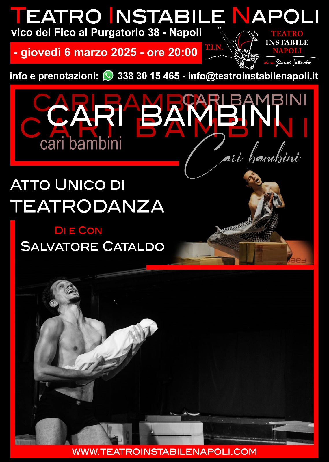 “CARI BAMBINI” sbarca in Italia come tappa fondamentale di una tournée internazionale tra Europa e Medio Oriente. Dopo El Cairo ed Istanbul, infatti, giovedì 6 marzo alle 20.00, arriva al Tin-Teatro Instabile Napoli. Lo spettacolo di teatrodanza è scritto ed interpretato dal performer Salvatore Cataldo. La pièce è un dolce grido che irrompe in un profondo silenzio. Un grido all’umanità che racconta la posizione di un artista di fronte ad una catastrofe.