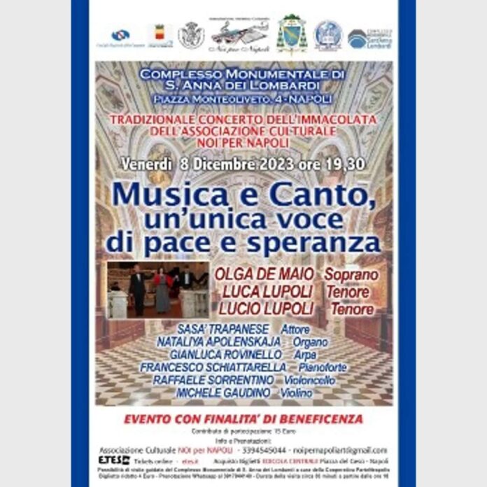 MUSICA E CANTO IN UN’UNICA VOCE DI PACE E SPERANZA. Questo il titolo che la storica Associazione Culturale Noi per Napoli APS ha voluto dare quest’ anno al Tradizionale Concerto dell’Immacolata 2023 che avrà luogo l’ 8 dicembre 2023 come apertura tradizionale ed ufficiale delle festività natalizie, presso lo storico Complesso Monumentale di Sant’Anna dei Lombardi, in Via Monteoliveto n.4 a Napoli alle h.19,30.