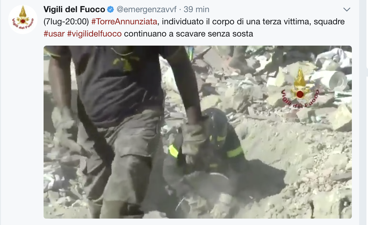 Crollo palazzina Torre Annunziata – Ore 20, aggiornamento Vigili del Fuoco su Twitter