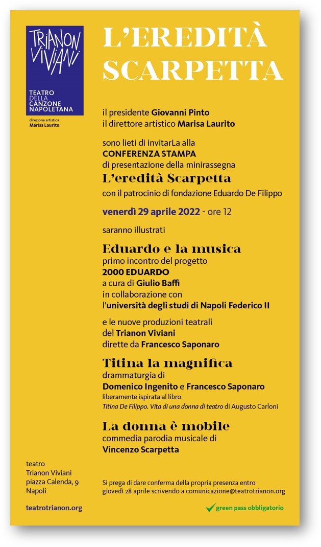 Venerdì 29 aprile, alle ore 12, presso il Teatro Trianon Viviani, si terrà la conferenza stampa di presentazione della minirassegna “L’eredità Scarpetta”, con il patrocinio della fondazione Eduardo De Filippo.
