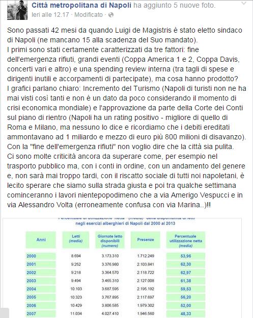 “Sono passati 42 mesi da quando Luigi de Magistris è stato eletto sindaco di Napoli (ne mancano 15 alla scadenza del Suo mandato). I primi sono stati certamente caratterizzati da tre fattori: fine dell’emergenza rifiuti, grandi eventi (Coppa America 1 e 2, Coppa Davis, concerti vari e altro) e una spending review interna (tra tagli di spese e dirigenti inutili e accorpamenti di partecipate), ma cosa hanno prodotto? I grafici parlano chiaro: Incremento del Turismo (Napoli di turisti non ne ha mai visti così tanti e non è un dato da poco considerando il momento di crisi economica mondiale) e l’approvazione da parte della Corte dei Conti sul piano di rientro (Napoli ha un rating positivo – migliore di quello di Roma e Milano, ma nessuno lo dice e ricordiamo che i debiti ereditati ammontavano ad 1 miliardo e mezzo di euro più 800 milioni di disavanzo). Con la “fine dell’emergenza rifiuti” non voglio dire che la città sia pulita. Ci sono molte criticità ancora da superare come, per esempio nel trasporto pubblico ma, con i conti in ordine, con un andamento del genere e, non sarà mai troppo tardi, con il riscatto sociale di tutti noi napoletani, è lecito sperare che siamo sulla strada giusta e poi tra qualche settimana cominceranno i lavori nientepopodimeno che a via Amerigo Vespucci e in via Alessandro Volta!“.