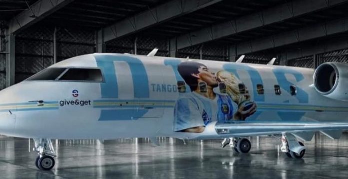 Si chiama “Tango D10S” l’aereo decorato con il ritratto di Maradona ed è una sorta di mostra itinerante di cimeli dell’ex capitano del Napoli.