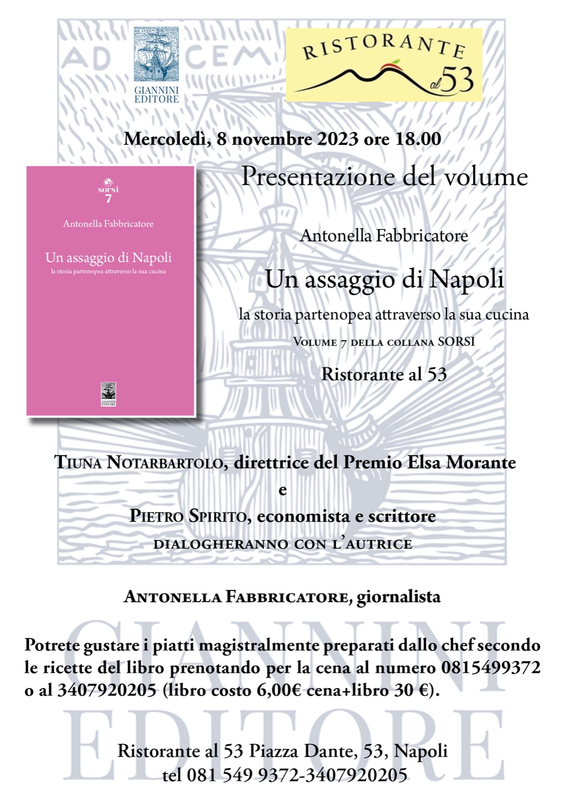 Napoli. Appuntamento con il gusto e la letteratura, mercoledì 8 novembre alle ore 18 la giornalista e animatrice culturale Antonella Fabbricatore presenterà il suo libro “Un assaggio di Napoli. La storia partenopea attraverso la sua cucina” presso il Ristorante al 53 di Piazza Dante, nel cuore di Napoli. Dialogherà con l’autrice il direttore del premio Elsa Morante Tiuna Notarbartolo e l’economista e scrittore Pino Spirito.