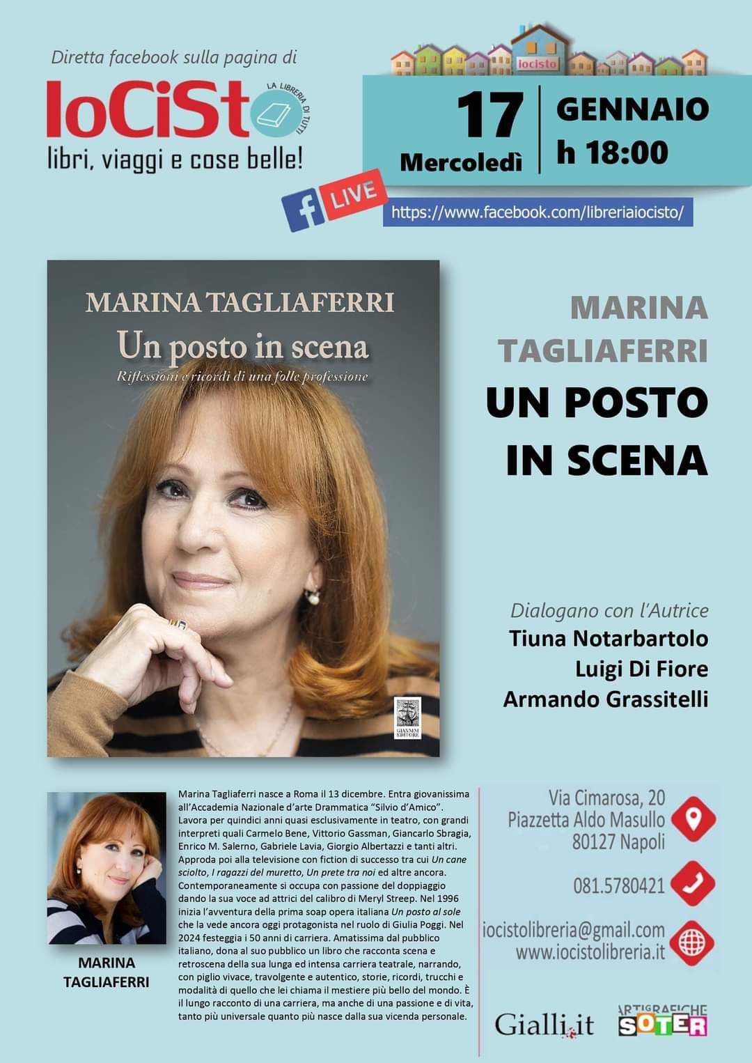 Un incontro tra amici e appassionati per parlare di teatro con la Tagliaferri, volto noto dello spettacolo e amatissima dal pubblico italiano per essere una delle protagoniste della fiction televisiva più longeva di Italia: “Un posto al sole”, in onda da più di due decenni su Rai 3. La celebre attrice dona al suo pubblico un libro che racconta scena e retroscena della sua lunga ed intensa carriera teatrale, narrando, con piglio vivace, travolgente e autentico, storie, ricordi, trucchi e modalità di quello che lei chiama il mestiere più bello del mondo.