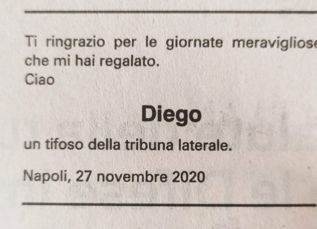 Il lutto cittadino è durato istituzionalmente due giorni, quello del funerale e ieri. Ma quello dell’anima continuerà in eterno. Perché il legame tra Diego Maradona e Napoli non cesserà mai di essere tale. E, tra i tanti modi di ricordarlo, oltre alle fiaccolate e i pellegrinaggi verso luoghi di vero e proprio “culto” come lo stadio San Paolo (tale ancora per poco prima di essere intitolato al D10S argentino), nelle scorse ore è spuntato anche un necrologio. Il testo, fatto pubblicare sul ‘Mattino’, è a firma di “un tifoso della tribuna laterale”, che si limita a ringraziare Diego “per le giornate meravigliose che mi hai regalato”. Poche parole, ma che valgono tanto e allo stesso modo descrivono in maniera perfetta cosa è stato capace di fare Maradona per Napoli e i napoletani.