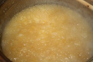 Ponete il tutto in una pentola larga; aggiungete altri 300 gr di zucchero e a fuoco lento cuocete per circa 1 ora, avendo cura di girare ogni 6-7 minuti, facendo attenzione. Se vi rendete conto che la confettura è asciutta, ma ancora non cotta, aggiungete via via un mestolo di quell’acqua che avevamo precedentemente conservato. (Fig 6 ).Consiglio a tutti – data la particolarità del frutto – di assaggiare la marmellata, una volta raffreddata, per stabilire se occorre aggiungere o meno lo zucchero; ciò dipende dalla maturità del frutto e dal vostro gusto.