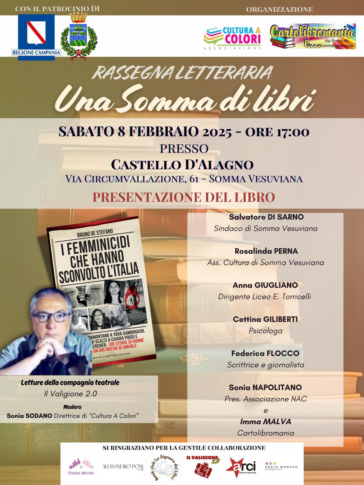 Sabato 8 febbraio 2025, alle ore 17:00, presso il Castello D’Alagno di Somma Vesuviana, si terrà un nuovo appuntamento della rassegna letteraria “Una Somma di Libri”. L’incontro sarà dedicato alla presentazione del libro “I femminicidi che hanno sconvolto l’Italia” di Bruno De Stefano, un’opera che ripercorre alcuni dei casi più drammatici della cronaca italiana, offrendo spunti di riflessione su un tema purtroppo sempre attuale.