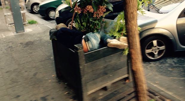 Alla redazione Il Mattino hanno segnalato la presenza di un uomo, dormiente, in una fioriera in via Nisco, zona via dei Mille, Napoli. In realtà non si tratta di un caso isolato, lo scorso maggio accadde la stessa cosa a piazza Rovetta, Brescia. Anche qui un uomo fotografato mentre schiacciava un pisolino in una fioriera.