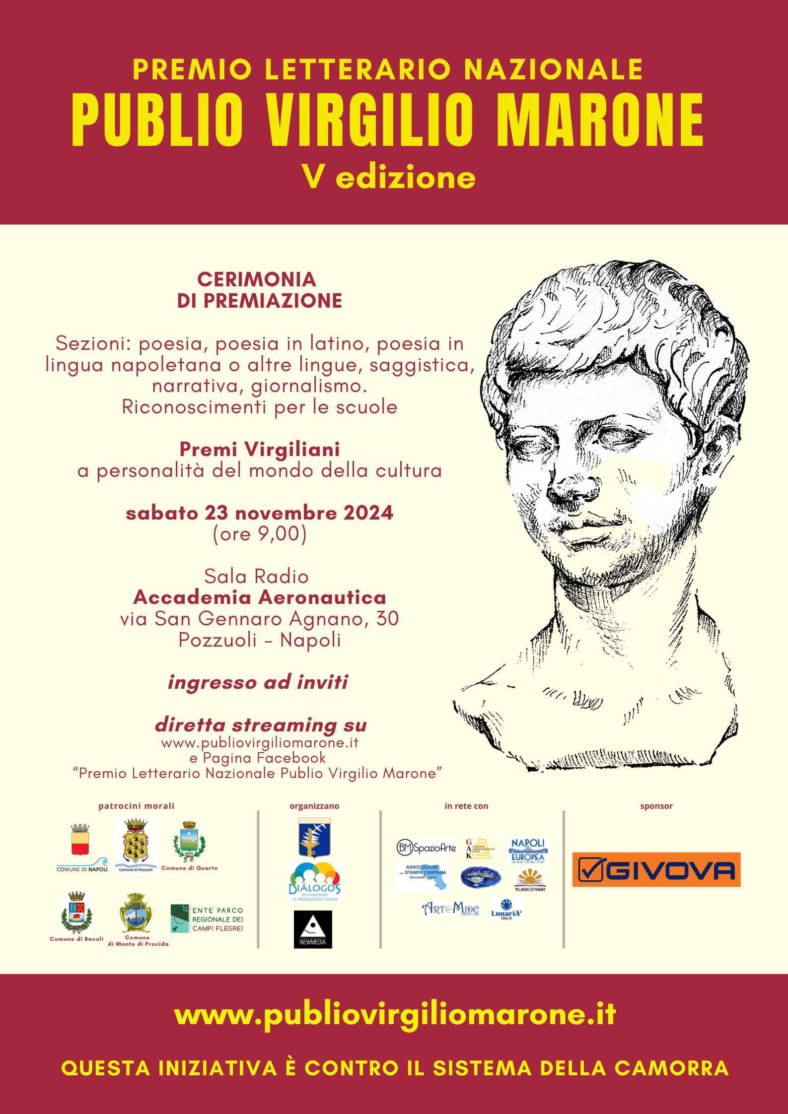 Il Premio Virgilio in questi ultimi anni è diventato un punto di riferimento nel panorama delle iniziative culturali di carattere nazionale. Quest’anno la cerimonia di premiazione, che si terrà nella mattinata di sabato 23 novembre sarà ospitata nella prestigiosa Sala Radio dell’Accademia Aeronautica in via San Gennaro Agnano a Pozzuoli. L’evento sarà trasmesso in diretta streaming sul sito del Premio (publiovirgilio.it) e sui social grazie alla regia di Salvatore Basile. Presenteranno Luisa Perfetto e Arturo Delogu. Fotografo ufficiale è Luigi Borrone.