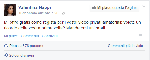L’attrice di film pornografici e, a breve a quanto pare, anche regista Valentina Nappi lancia una nuova provocazione sul web tramite il suo account Facebook ufficiale: “Mi offro gratis come regista per i vostri video privati amatoriali: volete un ricordo della vostra prima volta? Mandatemi un’email“, dice il suo messaggio.