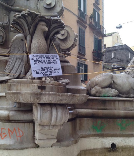 Tra le foto comparse sulla bacheca di De Stasio ce n’è anche una che mostra un singolare cartello, scritto in lingua napoletana e italiana, che invita i cittadini e i turisti a comportarsi bene e a non usare la fontana come una pattumiera. Altro segnale dell’incuria in cui versano i nostri monumenti più importanti.