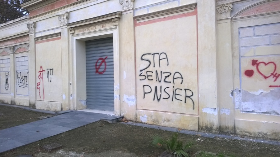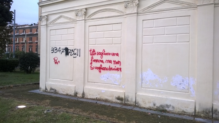 Nuovo scempio consumato ai danni di uno degli edifici che sono all’interno della Villa Comunale. La Casina Pompeiana, un edificio sottoposto ai vincoli della Sovrintendenza, eretto nel 1870 e recentemente restaurato, è stato di nuovo deturpato dai numerosi vandali che ormai scorazzano a piede libero a tutte le ore del giorno e della notte complice la quasi totale assenza di controlli. Le scritte oscene sono sulla facciata principale dell’edificio, in piena vista. Ancora più difficile sarebbe stato, infatti, non vedere se ci fossero stati i controlli necessari in uno dei parchi più importanti della città.