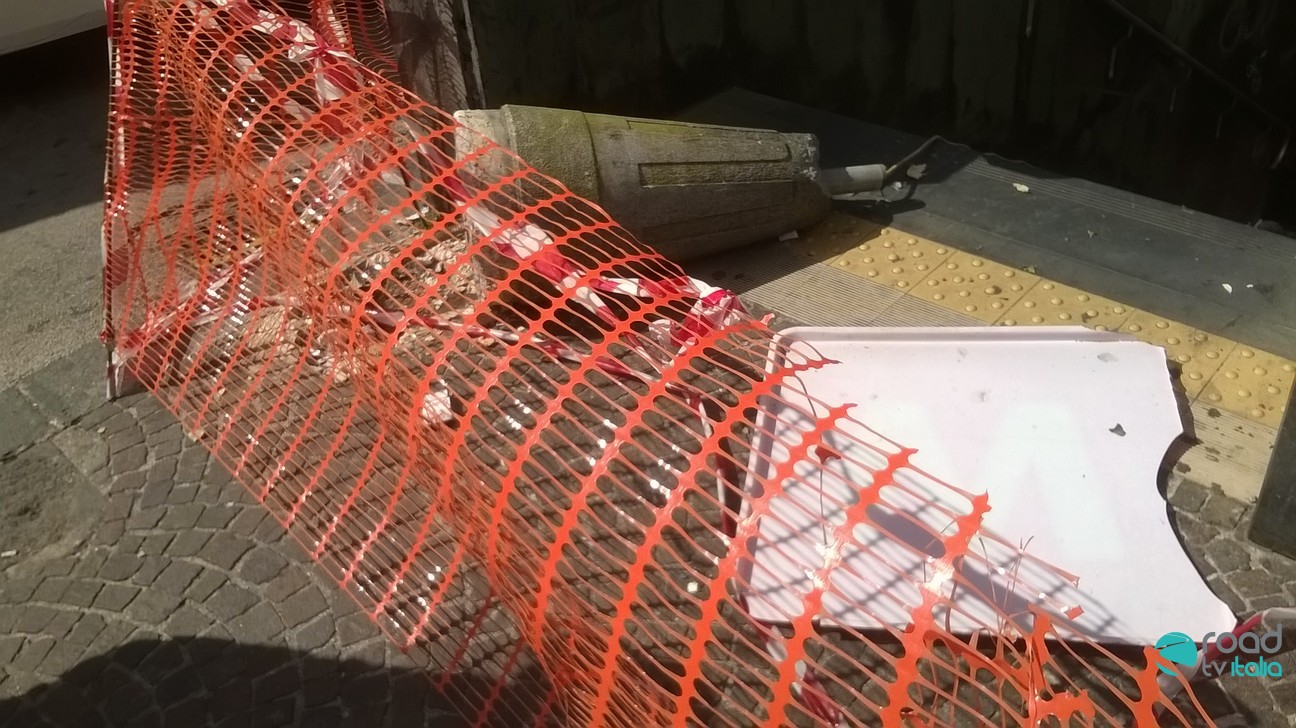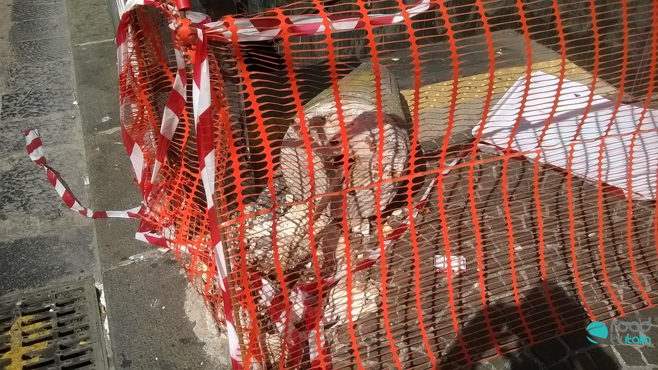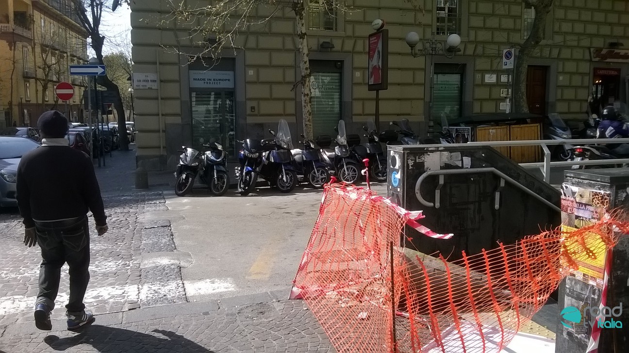 Siamo di fronte la Funicolare di Chiaia: all’incrocio tra via Bernini e via Cimarosa c’è uno degli ingressi/uscite della fermata Vanvitelli della linea 1 della metropolitana. Un’auto si è schiantata contro il cartello con la “M” che è finito lungo la scalinata che scende in stazione: dopo giorni l’area è recintata, ma è rimasto tutto così e si stanno aggiungendo anche rifiuti.
