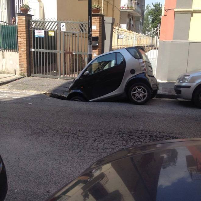 Paura a via Domenico di Gravina, quartiere Materdei, dove oggi pomeriggio improvvisamente una voragine di circa un metro di diametro si è aperta nei pressi di un marciapiedi antistante alcune abitazioni. Una Smart parcheggiata proprio in quel punto è stata parzialmente inghiottita, sprofondando con la parte anteriore all’interno della voragine.
