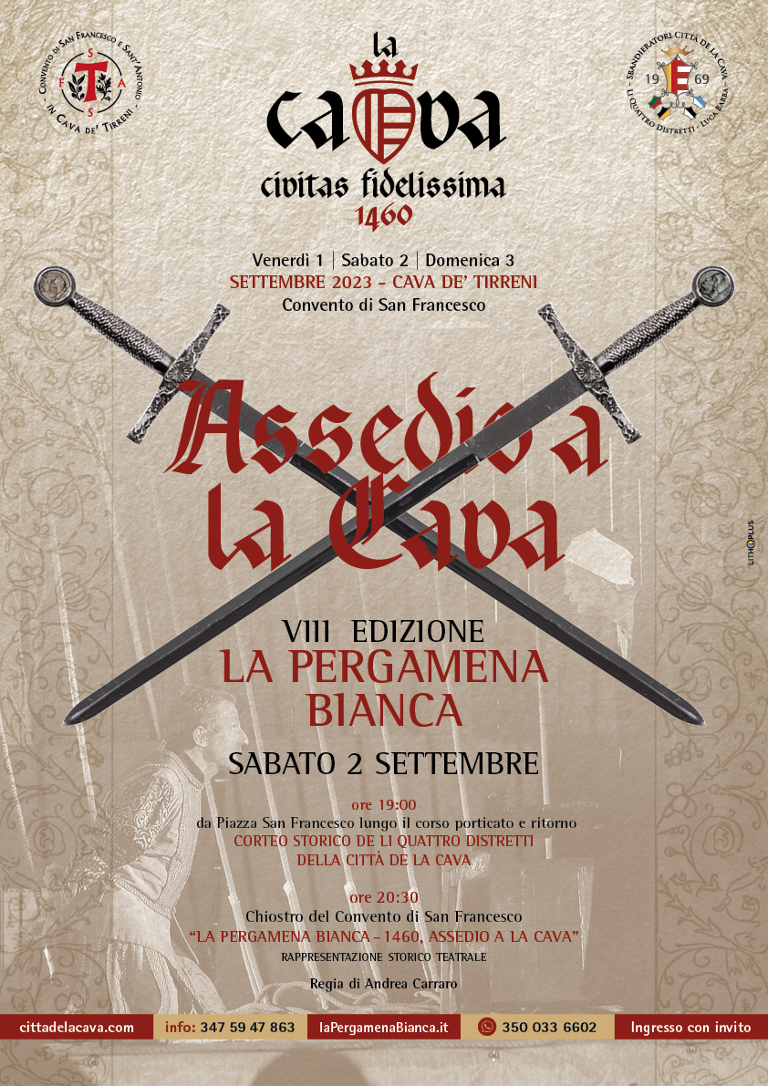 – sabato 2 settembre: alle 19, prenderà il via il “Corteo storico de li Quattro Distretti della Città de la Cava”, che partirà da piazza San Francesco e proseguirà lungo tutto il borgo porticato. Alle 20:30, invece avrà invece inizio larappresentazione storico-teatrale “La Pergamena Bianca – 1460, Assedio a La Cava” nel chiostro del convento francescano con ingresso ad inviti.